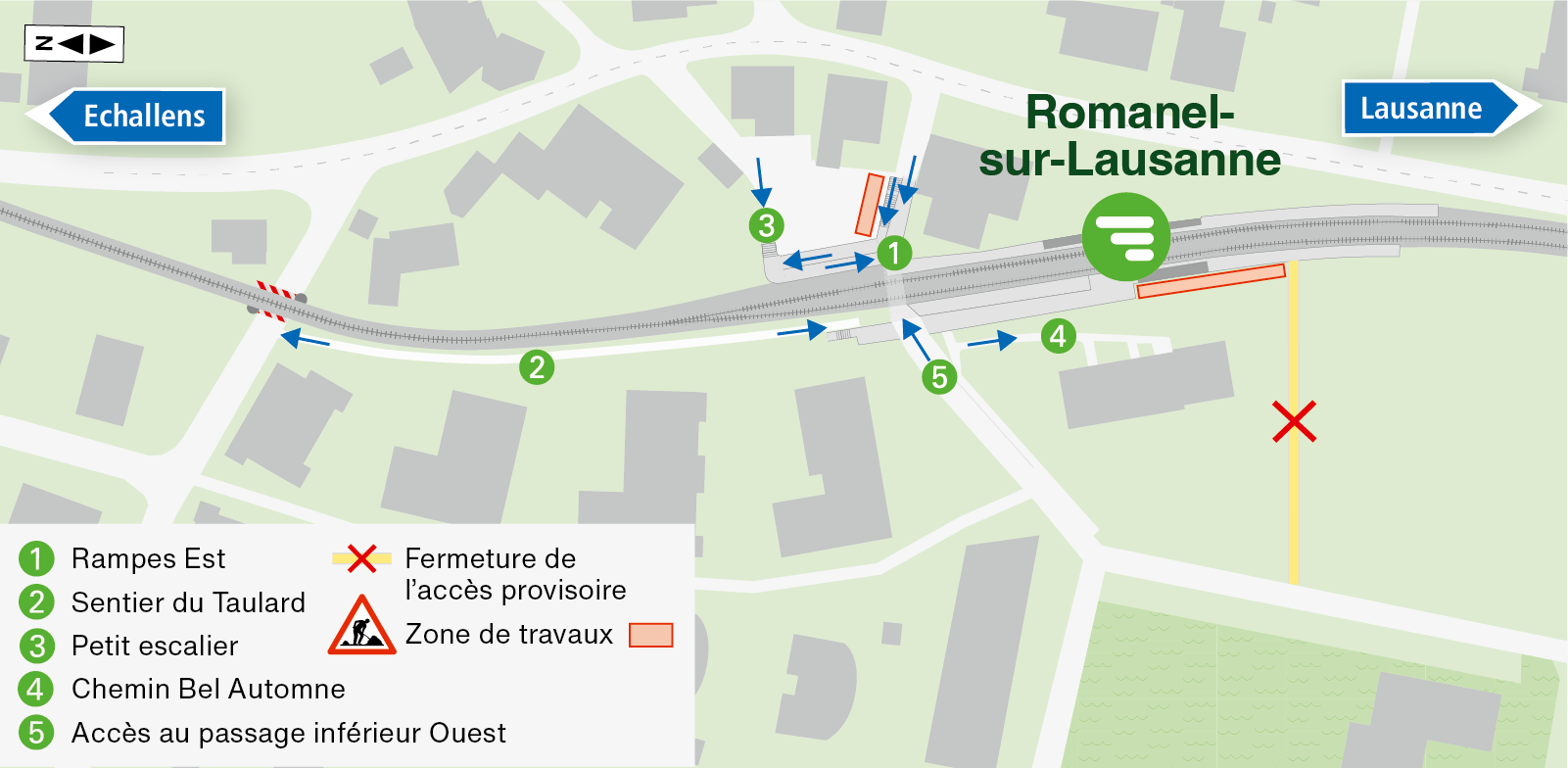 Dès le 5 novembre: ouverture du chemin Bel Automne ④ et de l'accès au passage inférieur Ouest ⑤ Fermeture de l'accès provisoire